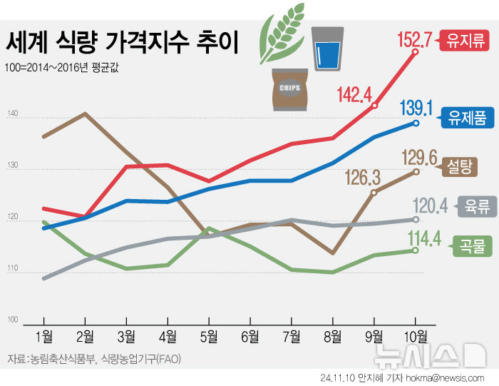 [서울=뉴시스] 지난달 세계식량가격지수가 전달보다 2% 올라 지난 9월부터 두 달 연속 상승세를 나타냈다. 유지류 가격지수는 전월보다 7.3% 상승했다. 팜유, 대두유, 해바라기유, 유채유 가격이 모두 올랐다. 주요 생산국의 낮은 생산량과 계절에 따른 생산 감소 우려가 영향을 미쳤다. (그래픽=안지혜 기자) [email protected]
