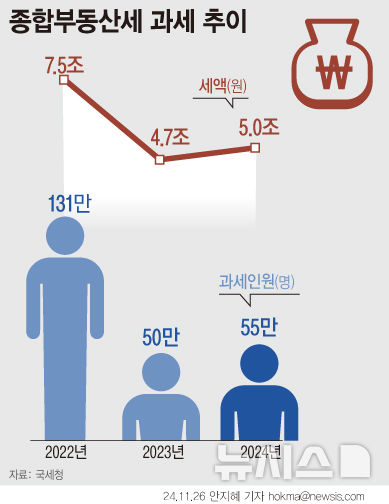 [서울=뉴시스] 올해 종부세 고지 인원 및 세액은 총 54만8000명, 5조원으로 공시지가 상승 등의 영향으로 1년전 보다 소폭 상승했다. (그래픽=안지혜 기자) [email protected]