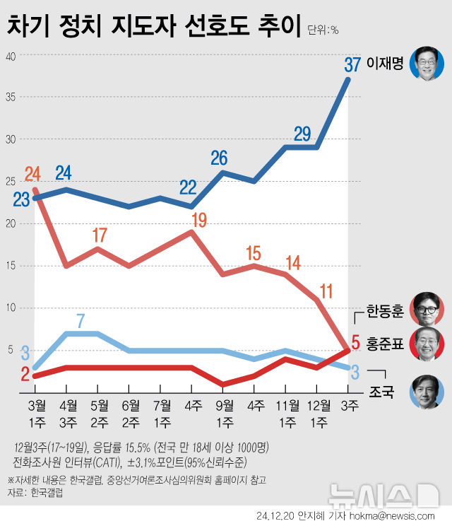 [그래픽] 차기 대통령감, 이재명 37%…한동훈·홍준표 5% (갤럽)