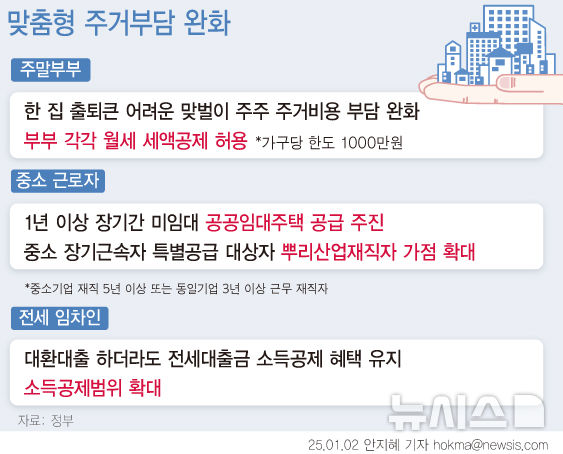 [서울=뉴시스] 정부가 주말 부부의 주거비용 부담 완화를 위해 부부가 각각 월세 세액공제를 받을 수 있도록 제도를 개편한다. 또 중소기업 근로자 등에게 1년 이상 장기간 미임대된 공공임대주택 공급을 추진한다. (그래픽=안지혜 기자) [email protected]