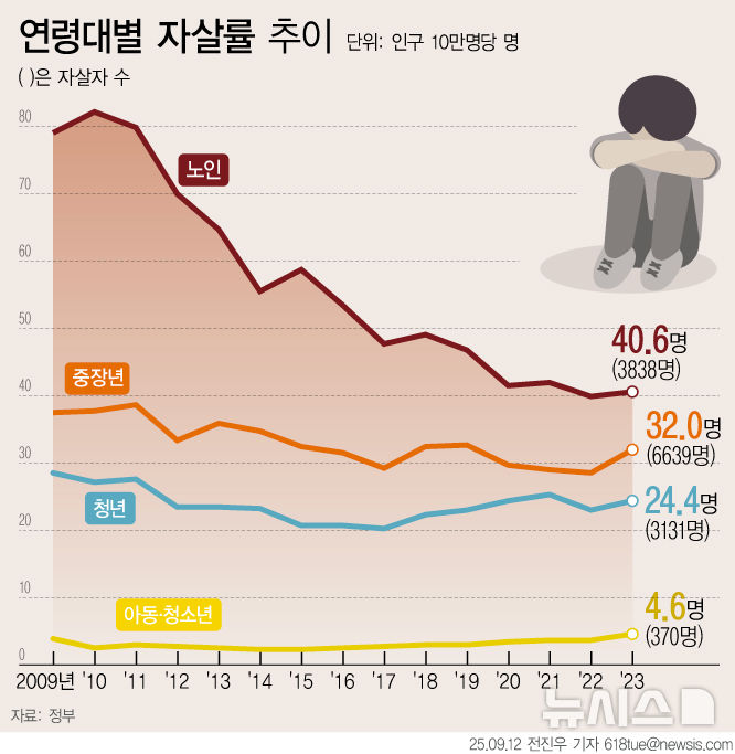 [서울=뉴시스] 12일 정부가 발표한 보건복지부 자료에 따르면 지난해 자살 사망자는 총 1만4439명으로 하루 평균 39.6명이 매일 삶을 등졌다. 2023년 기준 연령별 조사 결과 65세 노인 자살률은 40.6명으로 높은 상황이며 청년(24.4명)과 중장년(32.0명)도 취업·경제난, 고립 심화 등으로 자살률이 상승하고 있다. (그래픽=전진우 기자) [email protected]