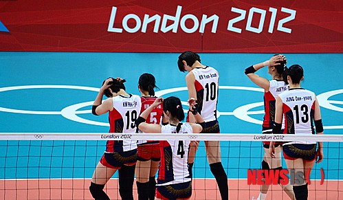 【런던(영국)=뉴시스】전신 기자 = 9일(현지시각) 오후 영국 런던 얼스코트에서 열린 2012 런던올림픽 여자 배구 준결승 한국과 미국의 경기에서 한국 선수들이 1, 2세트를 미국에 내준 후 아쉬워하고 있다.