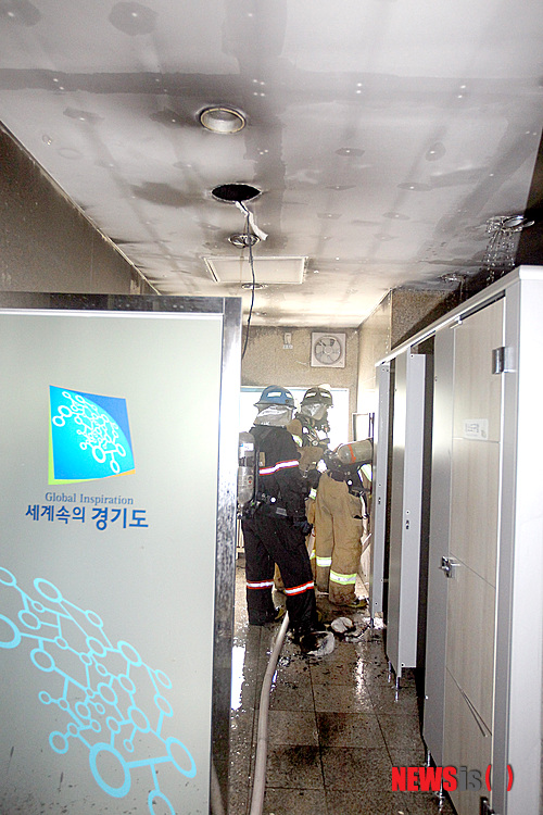 【수원=뉴시스】강종민 기자 = 13일 경기 수원 경기도청 제2별관 4층 남자화장실 배관함에서 화재가 발생, 소방대원들이 잔불정리를 하고 있다. 이날 화재로 청사 내에서 근무 중이던 공무원들이 대피하는 소동이 빚어졌다. 2013.06.13