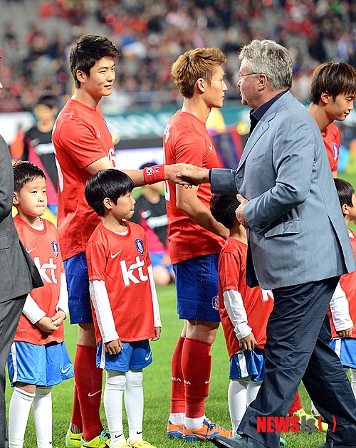 【서울=뉴시스】박영태 기자 =12일 오후 서울 상암동 월드컵 경기장에서 열린 한국축구국가대표팀과 브라질 축구국가대표팀의 평가전에서 전 히딩크 감독이 기성용을 격려하고 있다. 2013.10.12.
