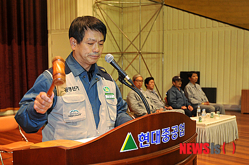 【울산=뉴시스】장지승 기자 = 현대중공업 제 20대 임원선거에서 18일 새벽 강성인 정병모 후보가 새 노조위원장으로 당선 확정되고 있다. 현대중공업 노조는 12년 만에 강경파가 위원장으로 당선됐다. 2013.10.18.