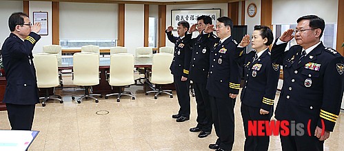 【서울=뉴시스】이성한(왼쪽) 경찰청장이 10일 오전 서울 서대문구 경찰청에서 10일자로 인사발령된 치안정감급 5명(이인선 경찰청 차장, 안재경 경찰대학장, 강신명 서울지방경찰청장, 이금형 부산지방경찰청장, 최동해 경기지방경찰청장)으로부터 보직신고를 받고 있다. 2013.12.10. (사진=경찰청 제공)