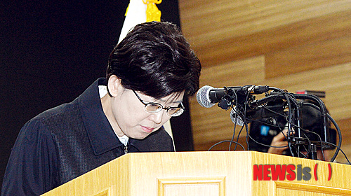 【서울=뉴시스】강진형 기자 = 최연혜 한국철도공사 사장이 10일 오전 서울 용산구 동자동 코레일 서울본부에서 수서발 KTX 법인화 관련 임시 이사회 결과 발표를 마친 뒤 인사하고 있다. 이날 열린 임시 이사회에서 12명의 코레일 이사가 참석한 가운데 ‘수서 고속철도 주식회사 설립 및 출자계획’을 전원동의로 의결했다. 2013.12.10.