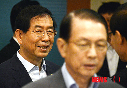 【서울=뉴시스】홍찬선 기자 = 박원순 서울시장이 10일 오전 청와대에서 열린 제25회 국무회의에 참석해 국무위원들과 티타임을 갖으며 김기춘 비서실장을 바라보고 있다. 2014.06.10.