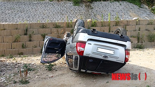 【춘천=뉴시스】박혜림 기자 = 19일 오후 강원 춘천시 덕두원리 한 도로에서 스포티지 차량을 운전하던 60대 남성이 강촌대교 7m 아래로 추락해 전복됐다. 2014.06.20. (사진=춘천소방서 제공)