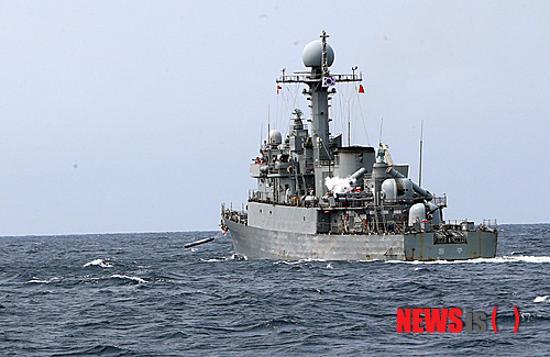 【동해=뉴시스】사진공동취재단 = 20일 강원도 동해상 실사격 훈련에 참가한 해군 초계함 원주함이 경어뢰 '청상어'를 발사되고 있다. 2014.06.20.