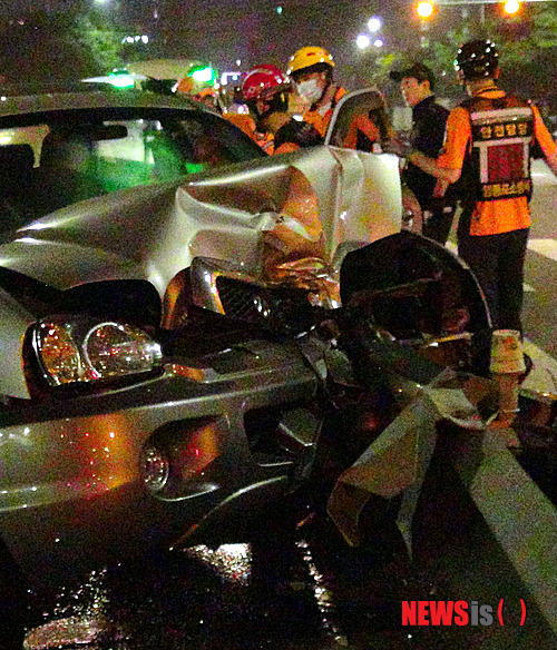 【서울=뉴시스】서재훈 기자 = 2일 새벽 03시 26분께 서울 영등포역 고가도로에서 문래역 방향으로 진행하던 싼타페 차량이 중앙분리대 시설물과 충돌하는 사고가 발생, 영등포소방서(서장 이홍섭) 구조대원들이 운전석에 끼여있던 운전자를 구조해 병원으로 이송하고 있다. 2014.07.02. (사진=영등포소방서 제공)
