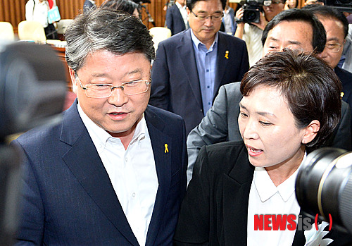 【서울=뉴시스】박동욱 기자 = 2일 서울 여의도 국회에서 열린 세월호 침몰사고의 진상 규명을 위한 국정조사특별위원회 전체회의에서 오전 조사가 중지된 후 새누리당 조원진 간사와 새정치민주연합 김현미 간사가 언쟁을 벌이고 있다. 2014.07.02.