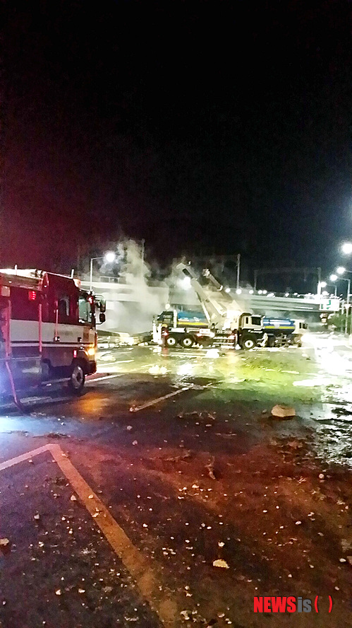 【여수=뉴시스】배동민 기자 = 13일 오전 0시13분께 전남 여수시 해산동 S교회 인근 4차선 도로에서 염산을 실은 2만2500ℓ급 탱크로리가 중앙분리대를 들이받고 넘어지면서 상당량의 염화수소가 누출돼 소방당국과 경찰이 도로를 통제하고 방제작업을 벌이고 있다. 2014.09.13(사진= 여수소방서 제공)