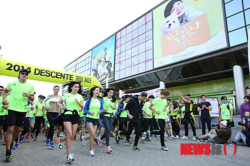 【서울=뉴시스】박문호 기자 = 13일 오전 경기도 과천 서울대공원 분수대광장에서 열린 '제 2회 2014 데상트 트레일 레이스'에서 참가자들이 힘차게 출발하고 있다. 이날 레이스에는 레인보우, 엠블랙, 에일리, 강하늘, 윤한, 이재윤, 차유람 등이 참가했다.