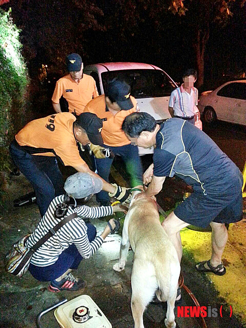 【서울=뉴시스】박문호 기자 = 13일 오전 서울 강동구 상일동 공원 인근에서 은퇴한 맹인안내견이 화단 경계철망에 목이 껴 구조요원들이 구조하고 있다. 2014.09.13. (사진= 강동소방서 제공)
