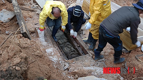 【대전=뉴시스】문승현 기자 = 대전시립박물관은 지난 1일 서구 갈마아파트 뒷산(갈마동 산 16-1번지)에서 조선시대 중종대 인물인 단양우씨 우백기(禹百期)로 추정되는 미라와 함께 습의(襲衣)를 수습했다고 3일 밝혔다. 2014.11.03. (사진=대전시 제공)