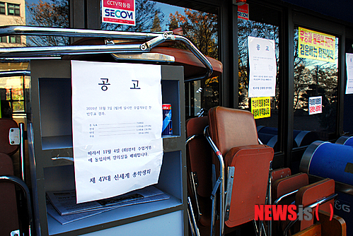 【청주=뉴시스】천영준 기자 = 청주대 학생들이 4일 김윤배 총장의 퇴진을 요구하며 3주간 수업거부에 들어간 가운데 각 단과대 출입문이 굳게 잠겼다. 앞서 총학생회는 지난 3일 수업거부 찬반투표를 실시했다. 그 결과 학생 7800명이 투표에 참여해 이 중 6055명(77.6%)가 수업거부에 찬성했다. 2014.11.04.