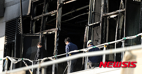 【인천=뉴시스】고범준 기자 = 11일 오후 3시 9분께 인천광역시 연수구 송도동 송도 D24블록 주상복합 공사 현장에서 화재가 발생, 25분만에 진화됐다. 사진은 화재로 인해 유리창들이 깨지고 철재 구조물들이 휘어진 모습. 2015.03.11.