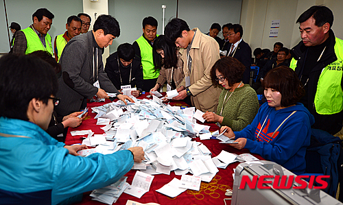 【광주=뉴시스】류형근 기자 = 제1회 전국동시조합장선거가 종료된 11일 오후 광주 서구 치평동 광주서구선거관리위원회 사무실에서 개표가 이뤄지고 있다. 2015.03.11.