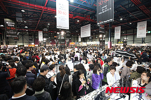 【서울=뉴시스】17일 서울 강남구 대치동 세텍에서 열린 롯데백화점 블랙쇼핑데이 행사장을 방문한 고객들이 제품을 보고 있다.