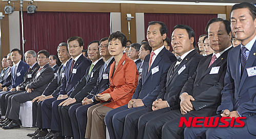 【춘천=뉴시스】김영욱 기자 = 박근혜 대통령이 11일 오전 강원도 춘천시 봉의동 강원도청 별관에서 열린 강원창조경제혁신센터 출범식에 최양희 미래창조과학부 장관, 최문순 강원도지사, 김상헌 네이버 대표, 한종호 센터장 등과 참석하고 있다. 2015.05.11.