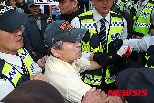 【서울=뉴시스】김진아 기자 = 13일 서울 영등포구 여의도역 인근에서 역사교과서 국정화 반대 서명 운동을 하고 있는 새정치민주연합 진성준 의원을 현장에서 폭행한 보수단체인 어버이연합 회원이 경찰에 연행되고 있다. 2015.10.13.