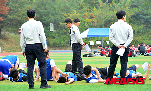 【고양=뉴시스】 배훈식 기자 = 2015년 제3차 순경공채 신체·체력시험이 22일 오전 경기도 고양 서울경찰수련장에서 열린 가운데 1000m 달리기 측정을 끝낸 응시생들이 운동장에 쓰러져 있다. 2015.10.22.