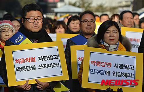 【서울=뉴시스】김선웅 기자 = 11일 오전 서울 여의도 더불어민주당사 앞에서 민주당 당원들이 유사당명 사용 규탄 및 금지 촉구 집회를 열고 더불어민주당의 민주당 당명 도용을 규탄하는 문구가 적힌 피켓을 들고 있다. 2016.01.11.