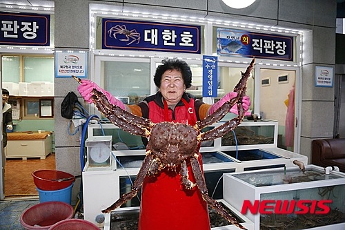 【울산=뉴시스】구미현 기자 = 지난 1일 울산시 북구 정자항 20마일 해상에서 제2대한호 선장 김종준(40)씨가 가자미 조업을 하던 중 몸길이 1.1m , 무게 6kg 이상 되는 왕게를 혼획했다. 이 왕게는 다음날인 2일 경매를 통해 50만원 상당에 판매됐다. 2016.02.03.