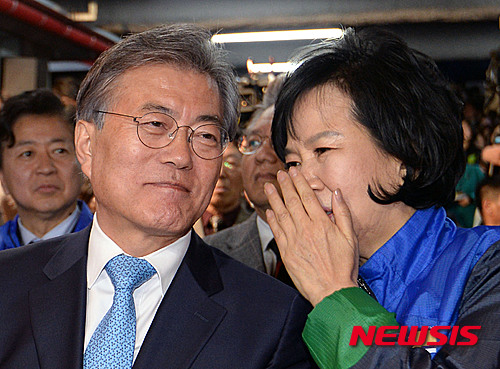【서울=뉴시스】홍찬선 기자 = 4.13 총선 서울 마포을에 출마한 더불어민주당 손혜원(오른쪽) 후보의 선거사무소 개소식이 열린 24일 오후 문재인 전 대표와 손 후보가 귀엣말을 하고 있다. 2016.03.24.