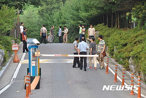 【김천=뉴시스】박홍식 기자 = 1일 오후 4시께 대구지검 김천지청에서 조사를 받던 우즈베키스탄 남성 A(30) 씨가 죄수복을 입은 채 달아났다. 김천교도소 직원과 경찰이 경북 김천시 교통 코아루 아파트 달봉산 입구에서 검거작전 회의를 하고 있다. 2016.08.01.