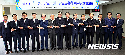 【무안=뉴시스】맹대환 기자 = 국민의당이 전남도, 전남도교육청과 4일 오후 전남도청에서 예산정책협의회를 갖고 협력을 다짐하고 있다. 2016.08.04 (사진=전남도 제공)