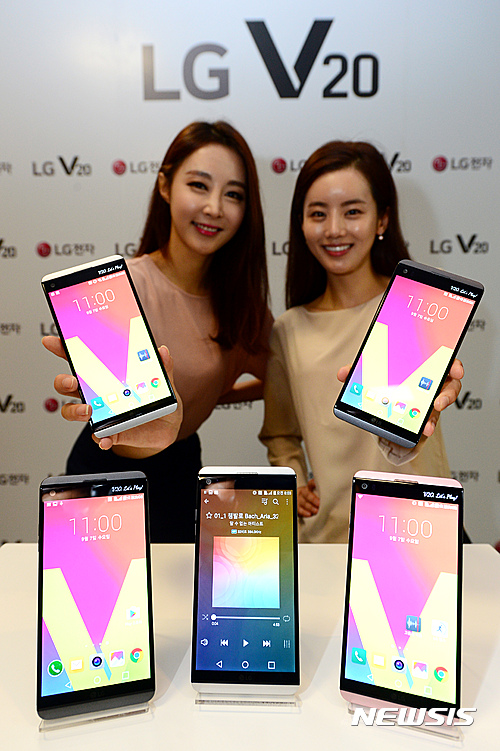 【서울=뉴시스】임태훈 기자 = 7일 오전 서울 서초구 양재동 LG전자 서초 R&D캠퍼스에서 열린 'LG V20 신제품 발표회'에서 모델들이 신제품 스마트폰 'V20'을 선보이고 있다.