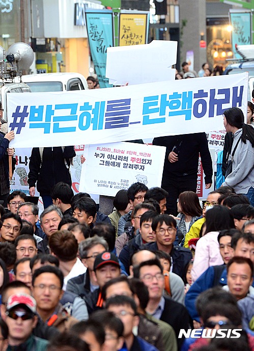 【부산=뉴시스】 하경민 기자 = 29일 오후 부산 중구 남포동 패션거리에서 부산지역 대학생과 철도노조 조합원 등 350여 명(경찰 추산)이 '비선 실세에 의해 국정을 농단한 박근혜 대통령의 하야' 등을 요구하는 집회를 갖고 있다. 2016.10.29.