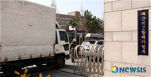 【평택=뉴시스】강종민 기자 = 7일 오전 실종자 가족 300~400여 명이 10일간 사용할 수 있는 2500만 원 상당의 생필품과 담요, 티셔츠, 일회용품 등으로 구성된 응급구호품 46세트를 실은 대한적십자사 경기도지사 차량이 경기 평택 해군2함대 사령부로 들어가고 있다.