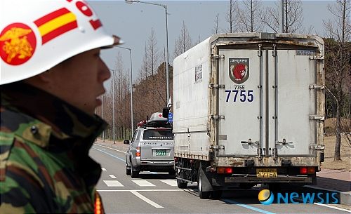 【평택=뉴시스】강종민 기자 = 7일 오전 실종자 가족 300~400여 명이 10일간 사용할 수 있는 2500만 원 상당의 생필품과 담요, 티셔츠, 일회용품 등으로 구성된 응급구호품 46세트를 실은 대한적십자사 경기도지사 차량이 경기 평택 해군2함대 사령부로 들어가고 있다.