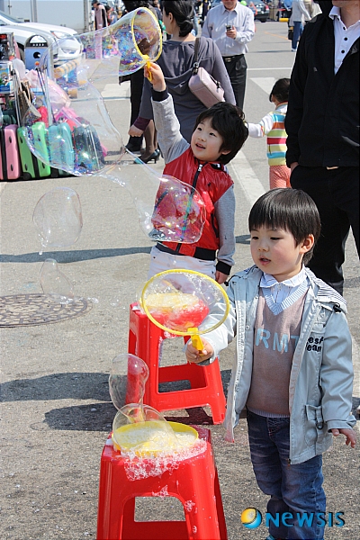 【삼척=뉴시스】조병수 기자 = 강원 삼척시 맹방유채꽃 축제가 '맹방 유채꽃과 봄가득 희망가득'을 주제로 17일 근덕면 상맹방리 일대에서 열리고 있는 가운데 아이들이 비눗방울 놀이에 빠져있다.