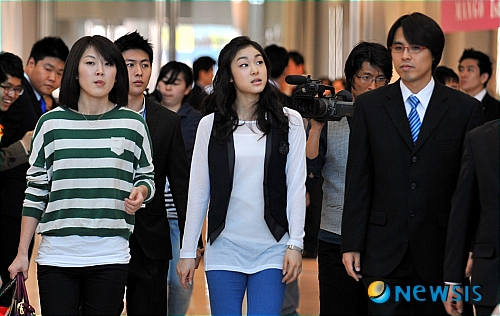 【서울=뉴시스】전진환 기자 = 24일 오후 김연아와 함께하는 독자와의 만남 행사가 열린 서울 영등포구 타임스퀘어에서 김연아가 경호원에 둘러싸인채 사인회장으로 들어오고 있다.