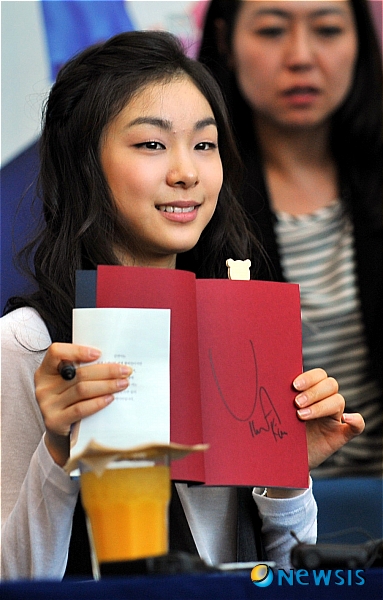 【서울=뉴시스】전진환 기자 = 24일 오후 김연아와 함께하는 독자와의 만남 행사가 열린 서울 영등포구 타임스퀘어에서 김연아가 책에 사인을 하고 들어보이고 있다.