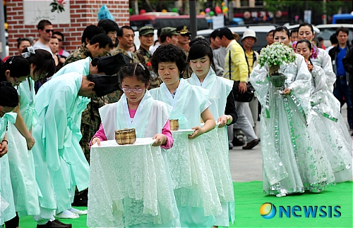 【서울=뉴시스】남강호 기자 = 5일 오후 서울 종로구 인사동 남인사 마당에서 백산소도 문화재단 회원들이 천안함 순국 장병 위령 추모제를 갖고 있다.