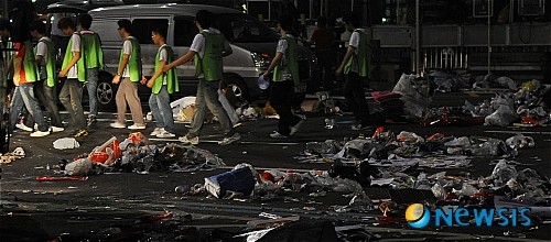 【서울=뉴시스】팽현준 기자 = 2010 남아공 월드컵 한국 대표팀 두번째 경기가 열린 17일 저녁 서울 강남구 영동대로 앞에서 시민들이 경기가 끝난 후 쓰레기를 버려둔 채 집으로 돌아가고 있다.