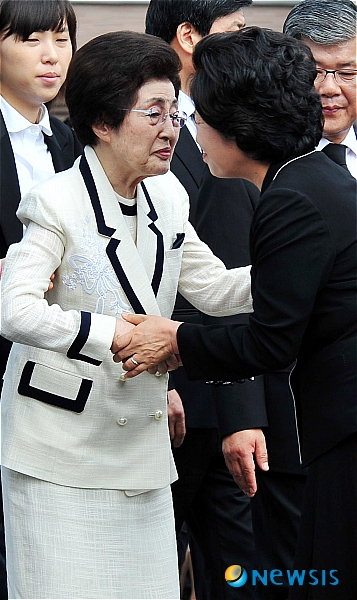 【서울=뉴시스】박주성 기자 = 18일 오전 국립서울현충원에서 열린 김대중 대통령 서거 1주기 추도식에서 이희호 여사와 권양숙 여사가 인사를 나누고 있다.