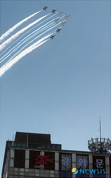 【서울=뉴시스】박종민 기자 = 28일 오전 서울 종로구 경복궁에서 '6.25전쟁 60주년 서울수복기념 국군의날 행사'가 열린 가운데 광화문 상공에서 공군 전투기의 축하비행이 펼쳐지고 있다.