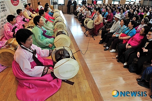 【서울=뉴시스】박세연 기자 = 1일 오후 서울 중랑구 시립중랑노인종합복지관에서 열린 '2010 노인의 날 기념 아름다운 어르신 축제'에서 가락장구 동아리 어르신들이 장구 연주를 선보이고 있다.