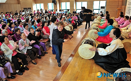 【서울=뉴시스】박세연 기자 = 1일 오후 서울 중랑구 시립중랑노인종합복지관에서 열린 '2010 노인의 날 기념 아름다운 어르신 축제'에서 가락장구 동아리 어르신들이 장구 연주를 선보이고 있다.