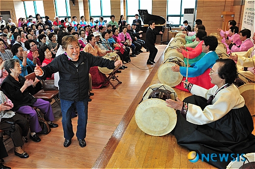 【서울=뉴시스】박세연 기자 = 1일 오후 서울 중랑구 시립중랑노인종합복지관에서 열린 '2010 노인의 날 기념 아름다운 어르신 축제'에서 가락장구 동아리 어르신들이 장구 연주를 선보이고 있다.