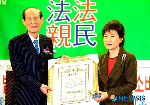 【서울=뉴시스】서재훈 기자 = 한나라당 박근혜 전 대표(오른쪽)가 13일 저녁 서울 반포 팔레스호텔에서 열린 '3회 대한민국 법률대상 시상식 및 신년하례회'에 참석해 이만섭 전 국회의장에게 상패를 전달하고 있다.