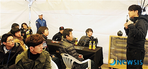 【서울=뉴시스】박동욱 인턴기자 = 3일 오후 서울 송파구 탄천주차장 내 카트체험장에서 열린 'EXR 팀 106 슈퍼루키 프로젝트 3차 카트레이싱 테스트'에서 류시원 감독이 참가자들에게 심사기준을 설명하고 있다.
