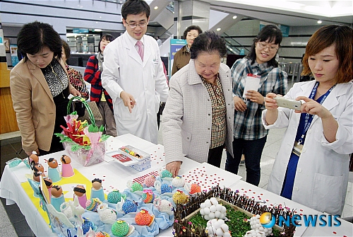 【대전=뉴시스】박병립 기자 = 을지대학병원(원장 황인택) 기독교 신자 모임인 신우회는 부활주일을 맞아 22일 병원 1층 로비에서 '달걀 콘테스트'를 열어 출품작을 전시하고 각 병동 환자들에게 1200여개의 달걀을 나누는 행사를 진행했다. (사진=을지대학병원 제공)