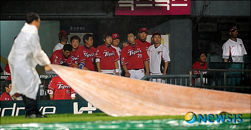 【서울=뉴시스】이동원 기자 = 8일 오후 잠실야구장에서 2011 프로야구 LG트윈스와 KIA타이거즈의 경기가 열렸다. 7회초 KIA공격 2사 상황 갑작스런 폭우로 경기가 잠시 중단되고 있다.